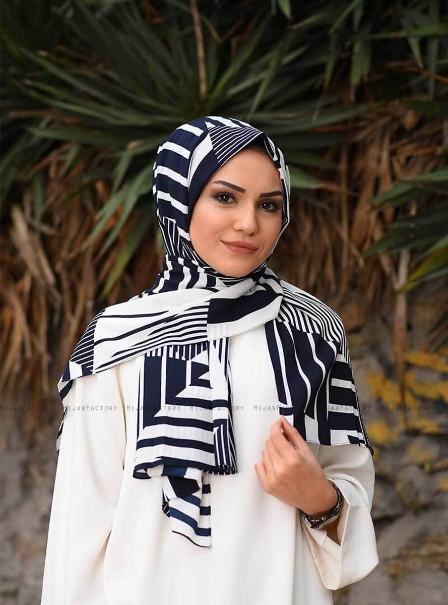 Marwa - Marineblå Mønstret Crepe Hijab Fra Mirach i Tyrkia.